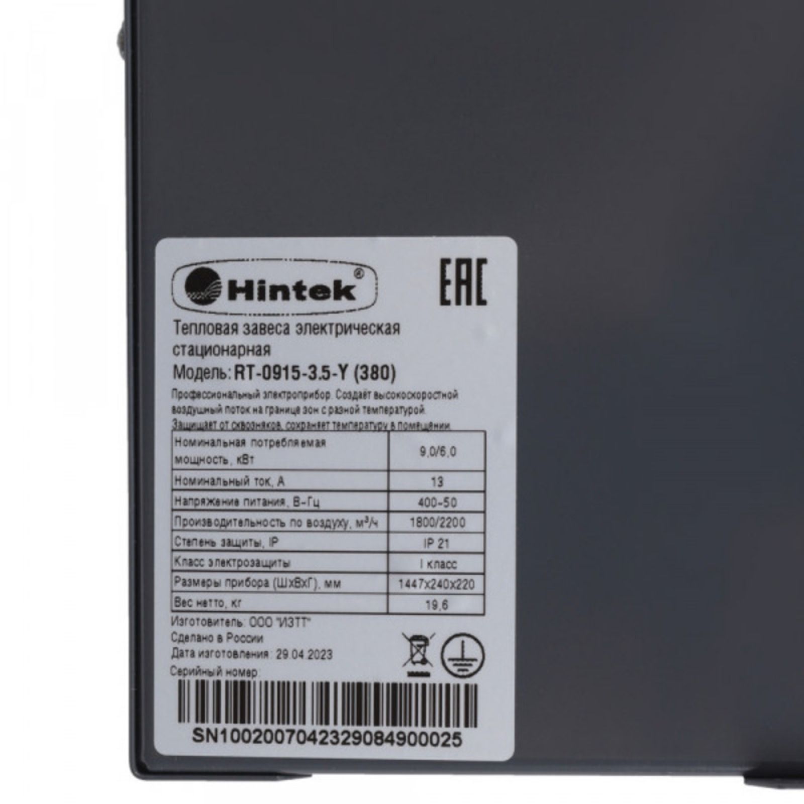 Описание товара: Тепловая завеса Hintek RW-2015-Y